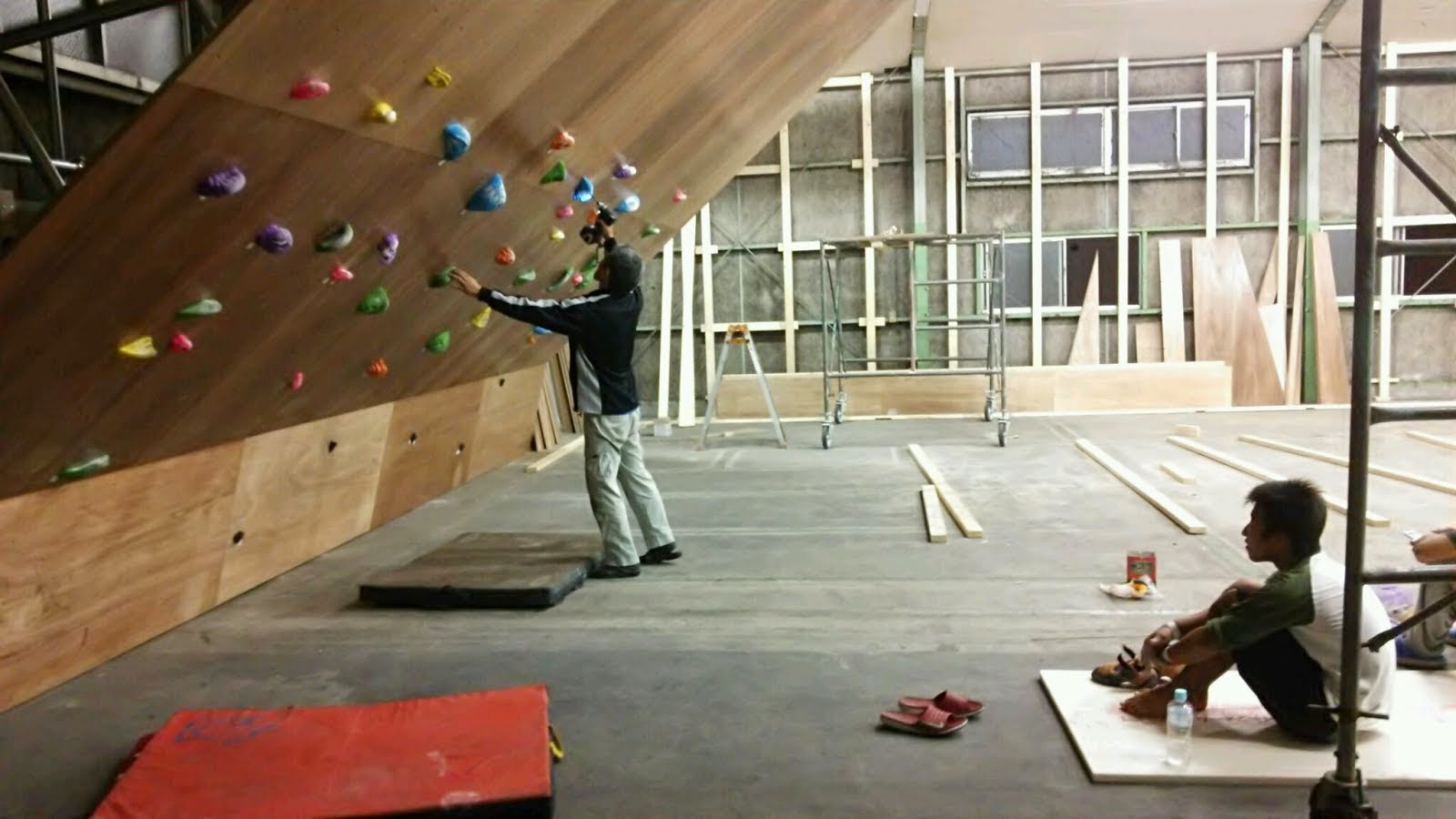 すでに昨夜は一段目だけ出来ていたのですが、さっそくホールドを取り付けてクライミング部活動をしていたのが若干二人。